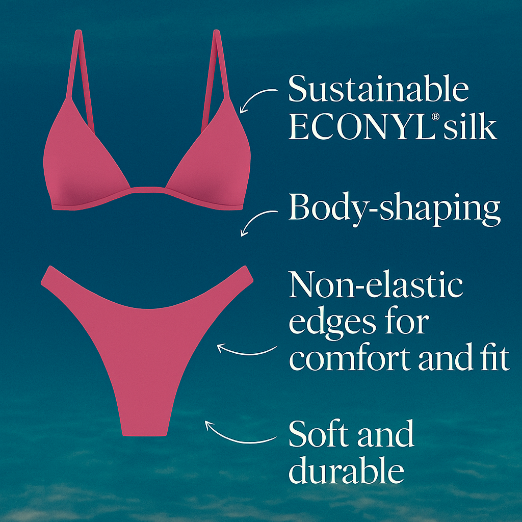 Crafted from ultra-soft ECONYL® silk, this suit blends elegance with sustainability. Its elastic-free edges sculpt gently to your body, offering a flawless fit, body shaping support, and long-lasting comfort, all while giving ocean waste a second life. Dive in, consciously.